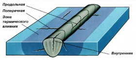 Подобные дефекты возникают по окончании затвердевания шва, обычно это наблюдается при 1200 °С. В этот момент соединение пребывает в двухфазном состоянии, т. е. по границам кристаллизовавшихся зерен еще имеется некоторое количество полужидкой стали. Горячие трещины не появляются, когда процесс первичного затвердевания шва завершается до начала критических растягивающих напряжений металла. Для этого важно в полной мере соблюдать технологию рабочего процесса, в частности не допускать резкого охлаждения сварочного соединения.